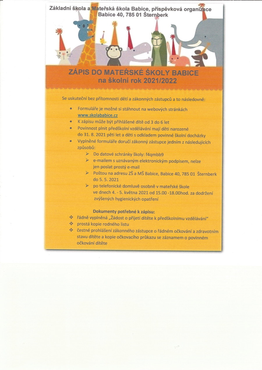 Úvod > Život v obci > Aktuality a hlášení > Zápis dětí do MŠ Babice na školní rok 2021/2022